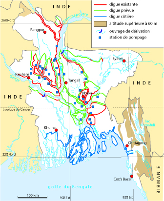 Les Nations-Unies et le sommet de l'Arche des sept pays les plus industrialisés (1989 à Paris) ont envisagé la nécessité de stabiliser les fleuves du Bangladesh. [...] Un schéma d'aménagement a été élaboré afin de diminuer ou de supprimer l'effet des crues tout en permettant l'irrigation durant la saison sèche.