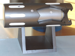Représentation d'un conteneur de stockage au Laboratoire de recherche souterrain de Meuse/Haute-Marne à Bure. Il est destiné aux colis de déchets de haute activité (déchets C). Légende : 1) Colis primaire en acier inoxydable 2) Colis de stockage en acier 3) Pain en céramique Son poids réel est d'environ 2 tonnes. (en haut à droite)